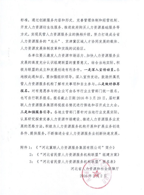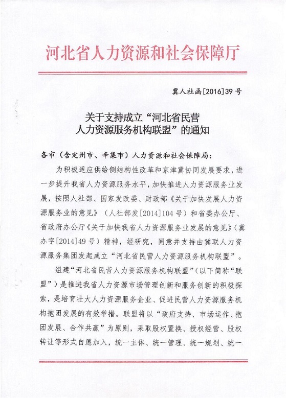 河北省民營人力資源服務機構聯盟是在國家“供給側改革”和“京津冀協同發展”的背景下,在河北省人社廳的大力支持下發起成立的。聯盟以“塑造河北民營人力資源服務品牌新形象、開創河北民營人力資源服務業發展新格局”為宗旨,致力于推動河北民營人力資源服務行業抱團發展,推動人力資源基礎性服務業務的政府購買與財政補貼申請,是實現各成員單位合作共贏的平臺,是推進河北省民營人力資源發展模式改革和政策創新的示范,是推動河北省經濟轉型升級、社會進步和京津冀協同發展的重要載體。