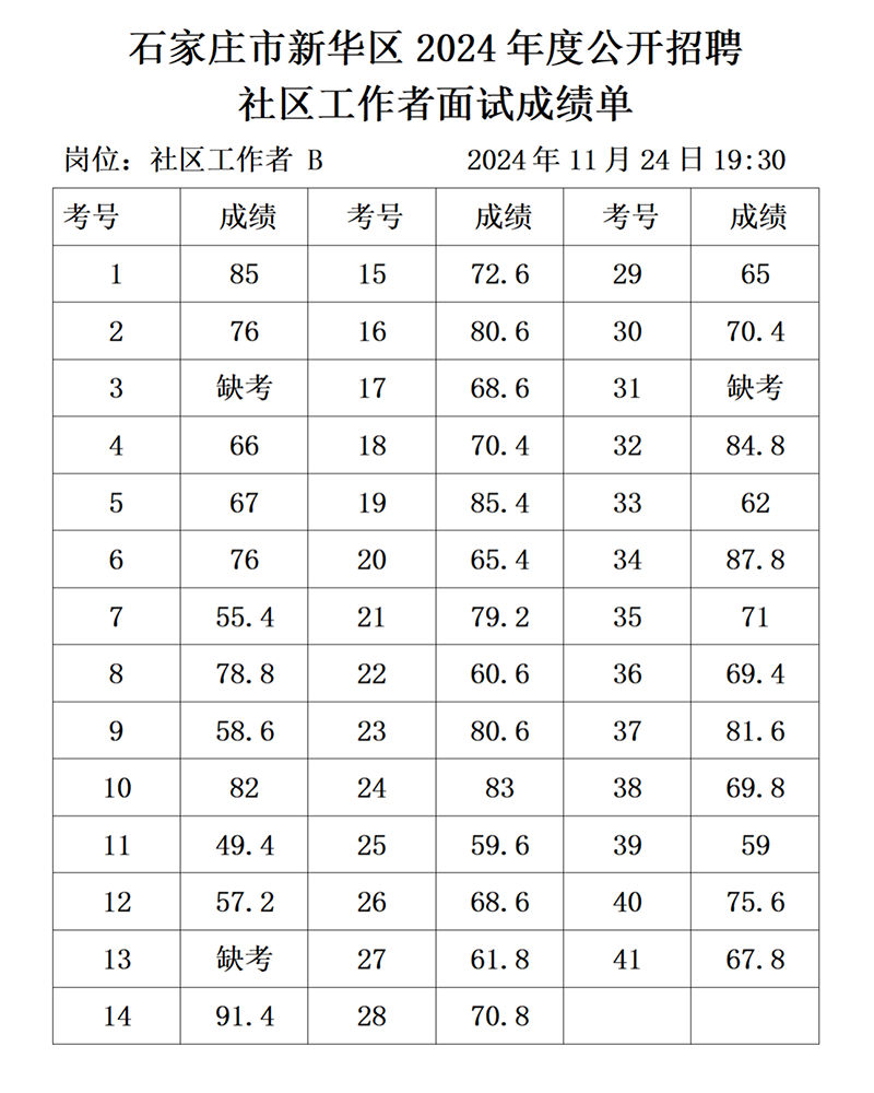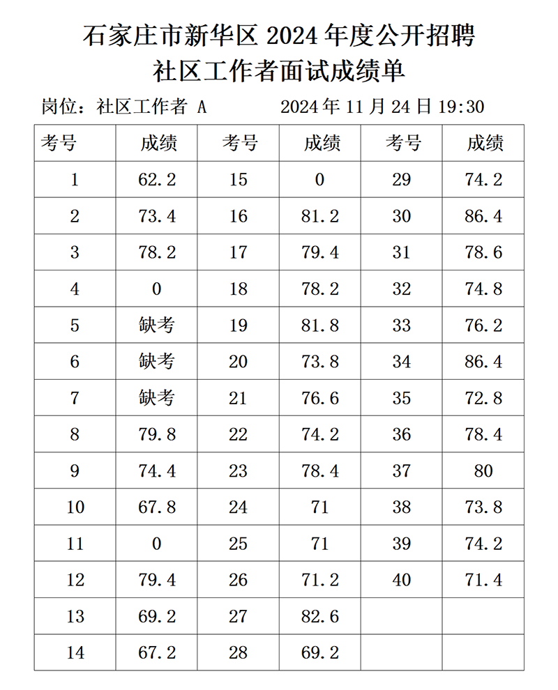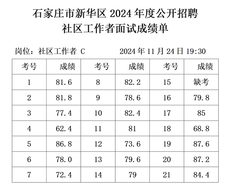 石家莊市新華區2024年度公開招聘社區工作者面試于2024年11月24日下午完成,各考生的面試成績在考試結束后已張貼在考點門口公示,現同步進行公布,具體如下: